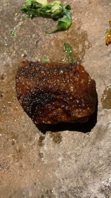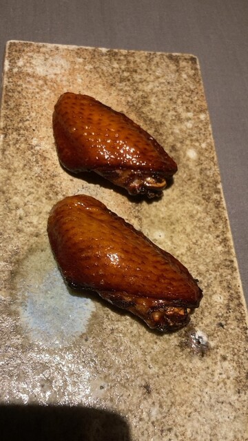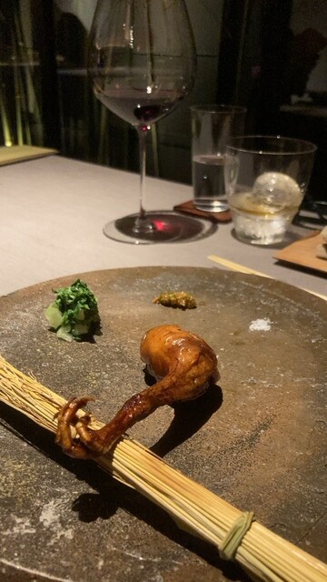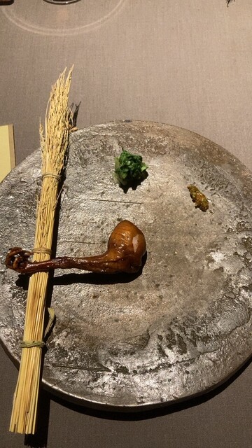 肉の火入れが最高なのです。表面はぷっくらとふくらんでいて、でも皮だけはパリパリになっていて香ばしい。強めに火が入っているはずの皮目の肉も火が入りすぎることはない。中華の技法なのでしょうか、本当にお見事ですね!見た目にもいぶすのにつかう藁を置いたり面白い。付け合わせの中華調味料さえなければフレンチのメインと言われても疑わないでしょう。中華調味料ついてますけど、塩だけの方が美味いです。