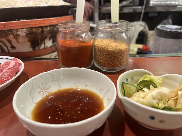 既に目の前のジンギスカン鍋には野菜がセットされ、タレとお新香が置かれています。