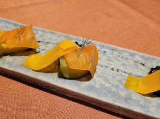燻製の信州サーモン、玉葱とトマトの刻み、ズッキーニの蒸焼き、茄子、南瓜とズッキーニを交配させた野菜、バルサミコ酢です。