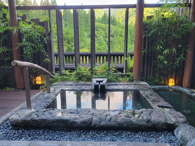 中でも巨大洞窟風呂は想像以上でした。奥行30mの本物の洞窟の中にあるのですが、単なるアトラクション的な楽しさだけではなく、pH8.0の低張性弱アルカリ性単純温泉は自然湧出で毎分275Lというとてつもない湧出量を誇り、源泉かけ流し、加水なし、源泉温度が低いため一部加温あり、殺菌剤なしというほぼパーフェクトな温泉であり、温泉好きには堪らないお風呂です。家族風呂は趣の異なるお風呂が4か所もあります。こちらは源泉かけ流しではなく循環式になりますが、洞窟風呂とは異なって、通常の露天風呂を楽しむことができます。