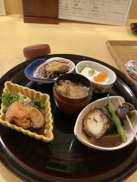 菜の花の辛子和え・あん肝ポン酢・自家製クリームチーズ豆腐・タコのやわらか煮・蛍烏賊の酢味噌和え。。