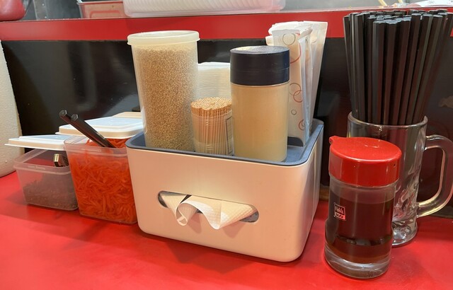 卓上にはラーメンダレ、コショー、ゴマ、紅生姜、辛子高菜。