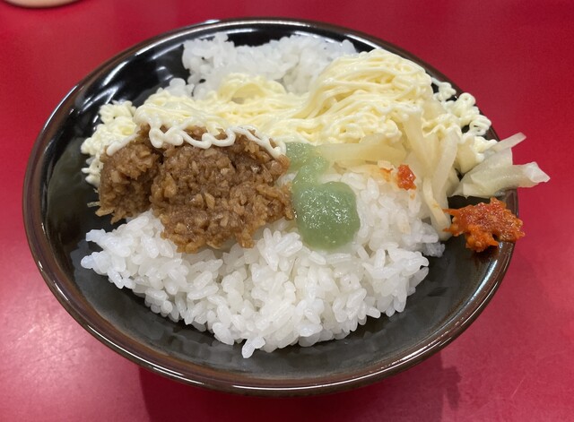 ライスに無限ニンニク、マヨ、刻み生姜、粗挽き唐辛子をのせます。