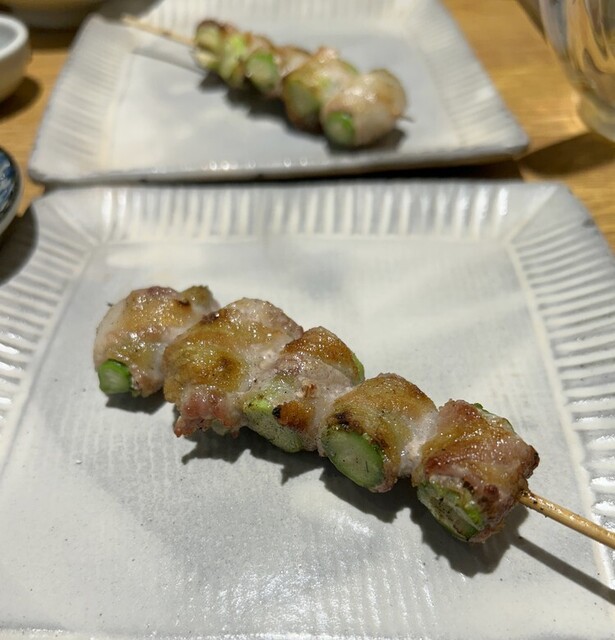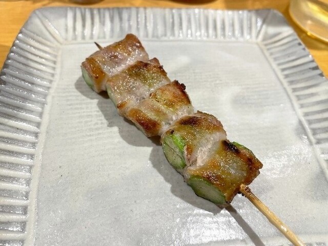 焼鳥コース1本目「アスパラ巻」、2本目「しそ巻」