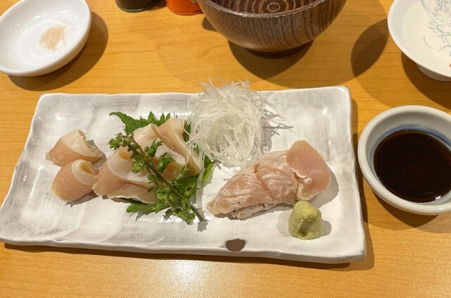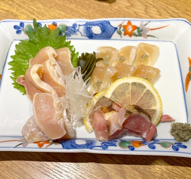 鳥刺しは、「ささみ・だきみ・ももタタキ・昆布じめ」の4種盛り!