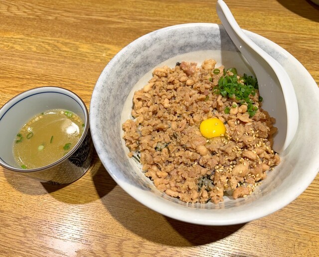 まずは半分そのまま鶏そぼろ丼を頂いたら、そぼろ丼に付いてくる鶏ガラスープを入れて「鶏そぼろ茶づけ」を楽しむという極上のウマ技なのです!!