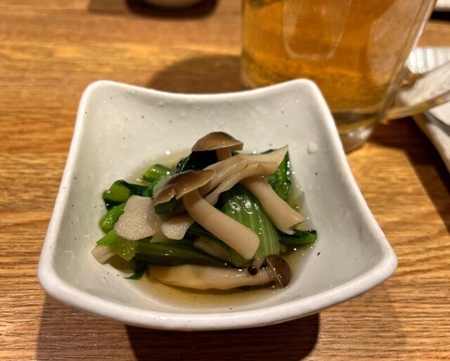 日替わりのお通しは和・洋 変るけど今回は「小松菜としめじ」の上品なお浸し