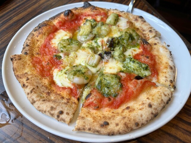 薪窯で焼いた炭の香りのもっちり生地の上にはトマトソースをベースに、モッツァレラ・ジェノベーゼソース・海老・イカ・カニ・タコ!