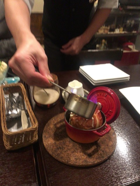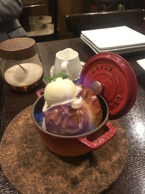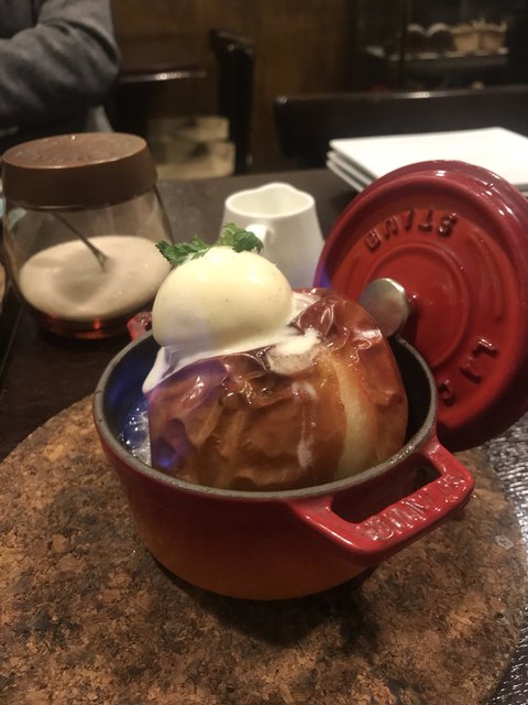 りんごのまるごとオーブン焼きにアルコールに火をつけた演出?付き。ガトーショコラにクランベリーのジェラート。三人で分けて丁度よい感じでした^_^