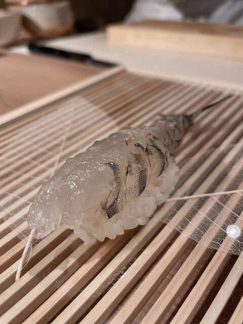 ◎◎ボタンエビ 踊り食い→生きた海老を見せてくれ、それを大胆に捌きます。頭の部分は焼いてくれて、香ばしく、パリパリといただきました。