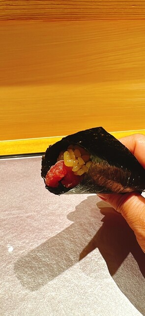 赤身に沢庵。バリっとした海苔を巻いて、間違いない一品。
