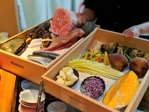 店の中心となるのが、オープンキッチンを囲むカウンター席のあるメインホール。豪壮な古民家の雰囲気を余すことなく味わえる素敵な空間です。そのほかにも個室的に利用できるスペースがいくつかあるようですが、この日は貸切ということでメインホールのカウンター席を占拠しての食事会です(^^)