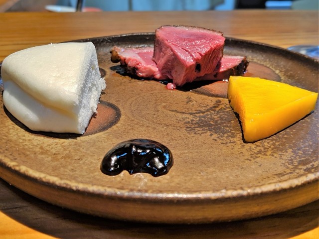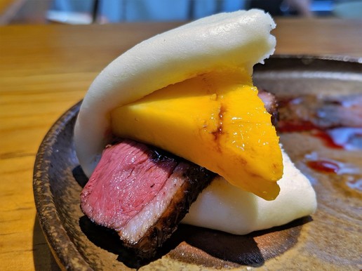 「四川スモークダック」も一風変わったアレンジが光っています。皮のついた厚切り肉と薄切り肉が用意されていて、厚切り肉は味噌をつけてそのまま、薄切り肉はマンゴーと一緒に中華パンに挟んでいただくという趣向。シェフの卓越したセンスには恐れ入ります。