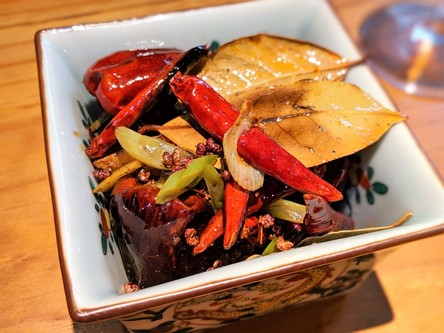 次の「スッポンの辣子鶏」はとっても刺激的! 鶏肉の代わりにスッポンを使ったというだけでもオドロキですが、それが様々な香辛料と見事にマッチしていること! ここでも青森の大蒜が良い仕事をしていました。