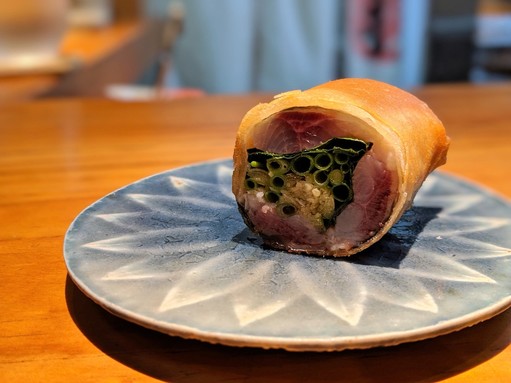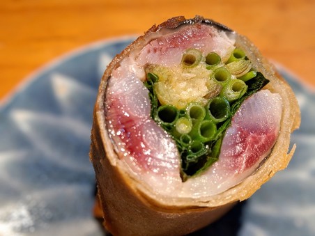 ここまでの料理でも既存の枠に囚われない新しい感覚の中華料理を十分に堪能できましたが、次の「いわし春巻き」も新境地です。