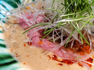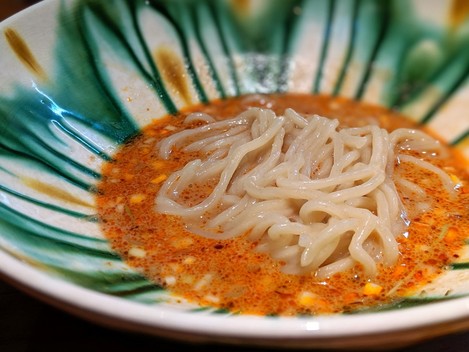 この店の定番料理だという「坦々しゃぶゃぶ」も和食の要素を取り入れたものでしょうか。花椒の香る濃厚な坦々スープに長崎産の黒毛和牛の薄切りを投入。胡麻ダレのしゃぶしゃぶに通じるところがありますが、スパイシーな風味が味を引き締めていて、味の深さではコチラの方が断然上を行っています。さらに残ったスープに麺を投入してて担々麺に! この店のルーツでもある愛知県・小牧市の名店「いづみ」の担々麺を思い出します。