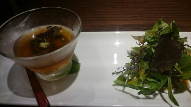 お通しは、湯葉のべっこうあんかけと雪野菜のサラダ