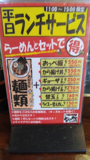 おっぺしゃん「おっぺしゃんラーメン&から揚げ2個」豚骨の日500円&130円平日ランチ&ライス無料