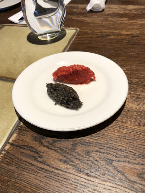 まず、熱々のパンにパンにつけるトマトペーストのさっぱりしたものとオリーブの塩味が良い感じのソースが登場