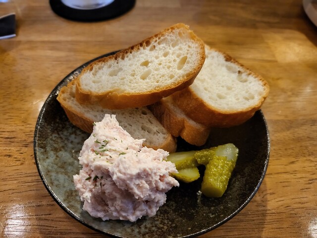 途中でいただいた、生ハムムースのバケット添え。これは適度な塩気のムースがバゲットにも、そしてアルコールにも合う逸品でした。