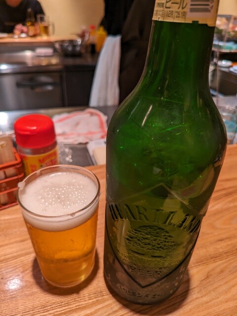 個人的には残念ですが、代わりにラガーの中瓶をファーストドリンクに。