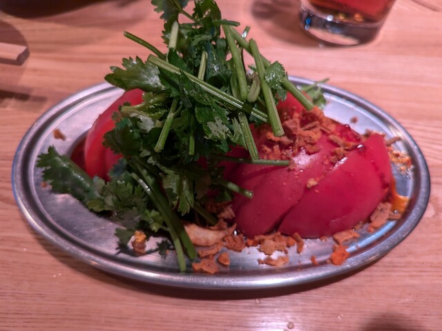 早速、三冷ホッピーの黒で体内冷却、そして冷やしトマトでヘルシーに攻めます。