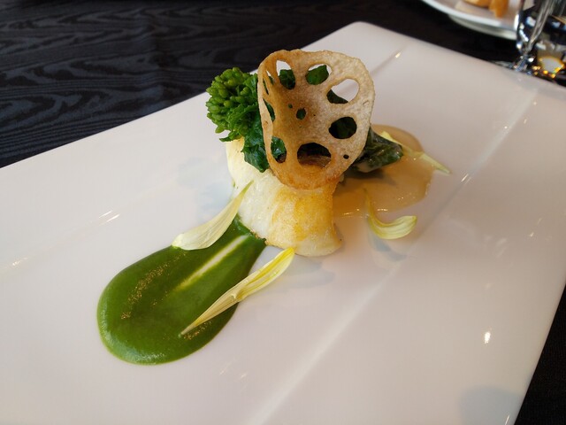 味もさることながらこちらのお皿のプレゼンが素敵でした。炭を使った黒いチュイル、菜花ソースの深い緑、マンゴーソースの鮮やかな黄色が白いお皿をキャンバスにモダンアートのように描かれていてお見事。思わず拍手したくなりました。