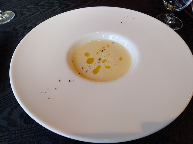 お皿に点々と振られた黒い物は乾燥したブラックオリーブだそう。私の舌ではスープに味わいを加えているところまでは感じられなかったのですが、このスープの器と相まって見た目がかっこいい事!