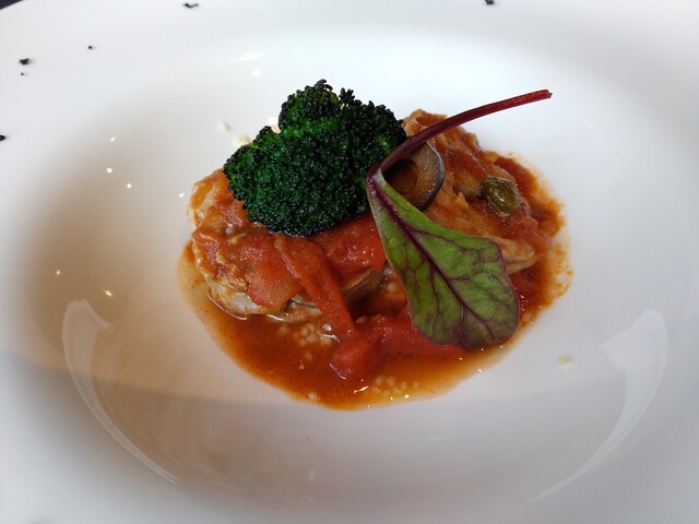 トマト煮込みとありましたが、黒オリーブやケッパーが入っているのでプッタネスカに着想を得ているのかなぁと思いながら食べました。馴染みのある美味しさ。
