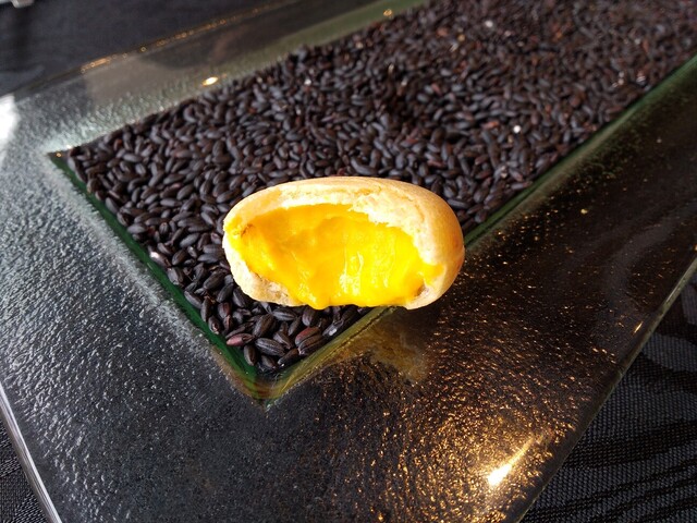 柔らかめのクリームチーズといぶりがっこが入った一口大の最中は、黒米が敷き詰められたお皿の上にちょこんと乗ってやってきました。アミューズ「楽しい!」という言葉通りにクスリとしながら頬張る一口は、最中の食感が面白く最中の皮が全体を柔らかい印象にしてとてもバランスがいい感じでした。