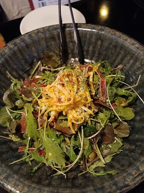 葉野菜を中心に、生ハム、チェダーチーズ、オリーブがちりばめられています。それをビネガードレッシングでいただきます。これも、チーズと生ハムの塩分を計算した味付けになっていますので、最初によくかき混ぜるのが美味しく食べるコツらしいです。かき混ぜないで食べると、ドレッシングの味が薄く感じるかもしれません。なお、味ですがビネガーの酸味とチーズと生ハムのコクがとても美味しいです。量はそこそこありますが、価格的にはあと200円位安いと神メニューなんだけどなぁ・・・。