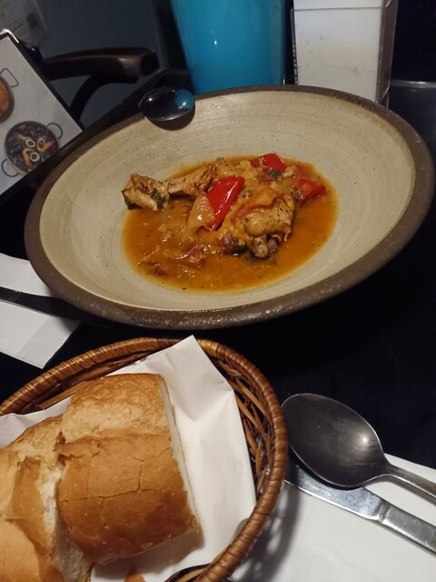 「チリンドロン」とは、色鮮やかな野菜をたくさん煮込んで作ったソースで鶏肉を煮込んだもののようです。今回は、鶏肉はレッグをしっかりと煮込んでいました。とても柔らかくて美味しいのですが、特筆すべきはソースです。野菜特有の甘さとうまみがすごく出ています。これ、煮込むのにすごい手間と時間がかかっているのではないか、、と思うと、感動の一品です。
