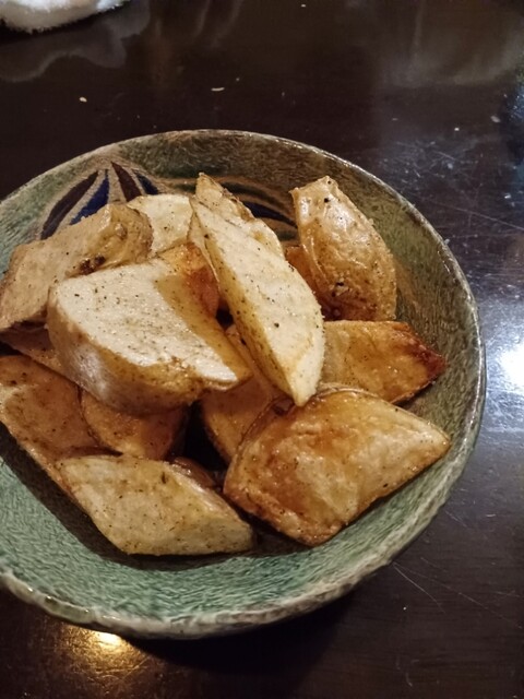 男爵のポテトフライですもの、美味しくないわけがありません。このポテトは乱切りで揚げられています。京都の塩でまぶしてあります。素材の味を楽しむ感じです。