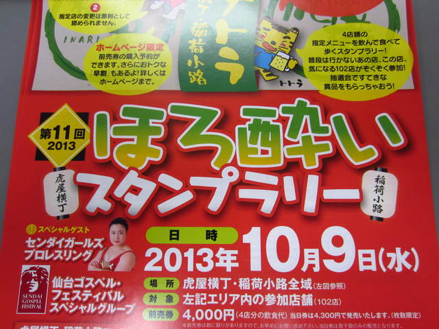 年に1度、酔っ払いが町を占拠する。北は定禅寺通、南は広瀬通、西は国分町、東は一番町通に囲まれたエリア、ここの飲み屋さんがスクラム組んで、酔っ払いをお・も・て・な・しする。このイベント、東北随一の繁華街国分町に隣接したこの地区にある稲荷小路と虎屋横丁の名を採って、イナトラほろ酔いスタンプラリーという。今年で11回目の開催だそうだ。
