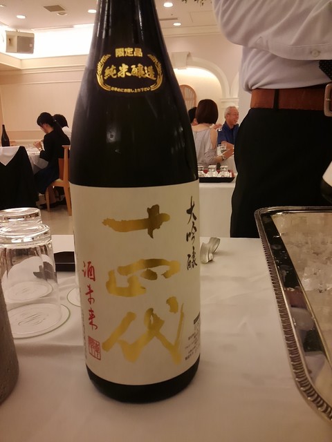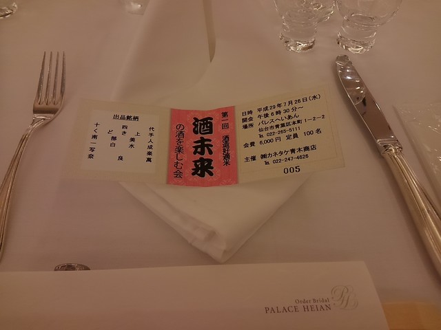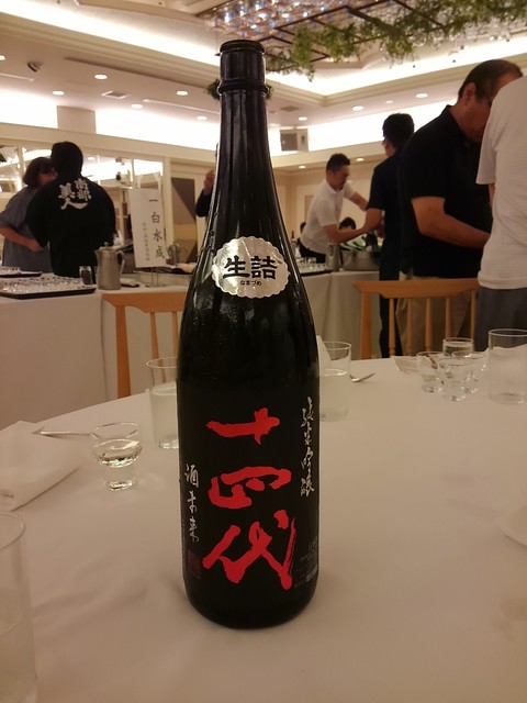 パレス平安で開催された、青木商店主催の「第一回酒造好適米酒未来の酒を楽しむ会」で贅沢な酒をたくさん飲みました。会の冒頭、酒造好適米“酒未来”について勉強会がありました。その概要ですが、十四代の蔵元・高木酒造これまで、酒未来、龍の落とし子、羽州誉の3種の酒米を開発したそうで、うち酒未来は、美山錦(♂)と山田錦系の米(♀)を掛け合せ作った米で、当時“くどき上手”など志の高い若手の酒造家に「使ってみないか」と声掛けし、現在、全国の14酒蔵が使用している酒造好適米だそうです。まさに “日本酒の未来”のため、多くの費用と長い年月をかけた酒米を他の蔵元に提供するとは、高木辰五郎(現会長)氏は何と思慮深く、太っ腹な方なのでしょうか。
