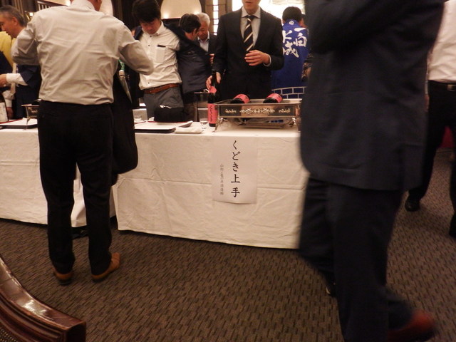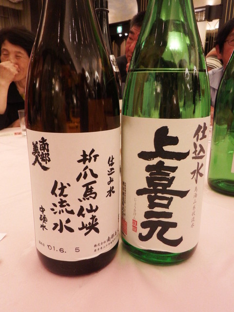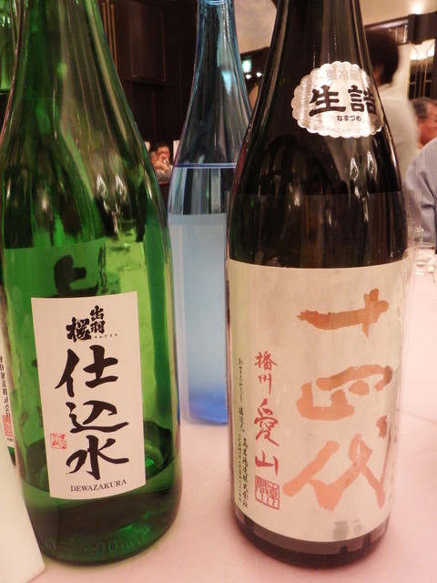 カネタケ青木酒店㈱主催の幻の酒造好適米愛山の酒を楽しむ会。今年で16回を数える会に、西から雨後の月(広島)、鳳凰美田(栃木)、日高見(宮城、石巻)、上喜元(山形、酒田)、くどき上手(山形、鶴岡)、出羽桜(山形、天童)、南部美人(岩手、二戸)、一白水成(秋田、五城目町)の9蔵が集まり、幻の酒造米で作った自慢の数十本の酒と9人の醸し人を送りました。更に、十四代(高木酒造)はテーブルに1本の播州愛山純米吟醸中取り1800ml純米吟醸酒を提供しました。