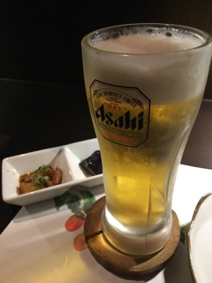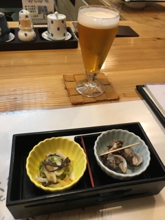まずは、ビールとお通しを堪能しながら、お店オススメのお刺身を待つ。