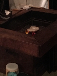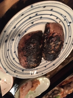 このジュレを食べたら、囲炉裏で皮を焼いてくれる。