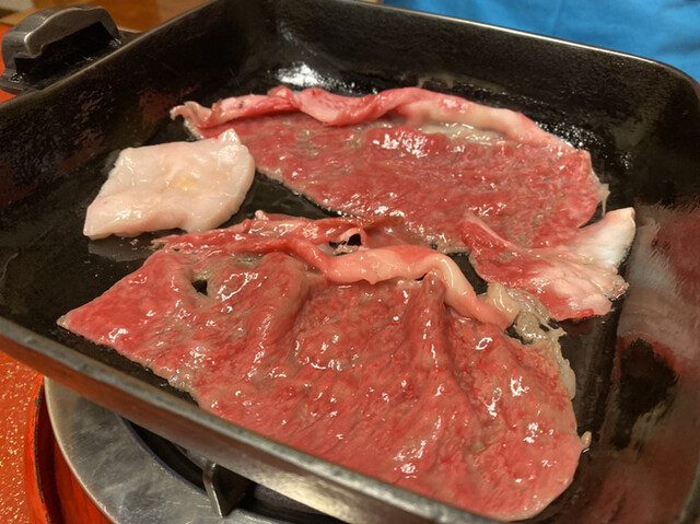 さて、まずは前菜やミニステーキなど出てきまして、すきやきに。肉素敵、食欲そそられまくりますね。少し濃い目の味です。それがまたご飯が食べたい誘惑にかられます。