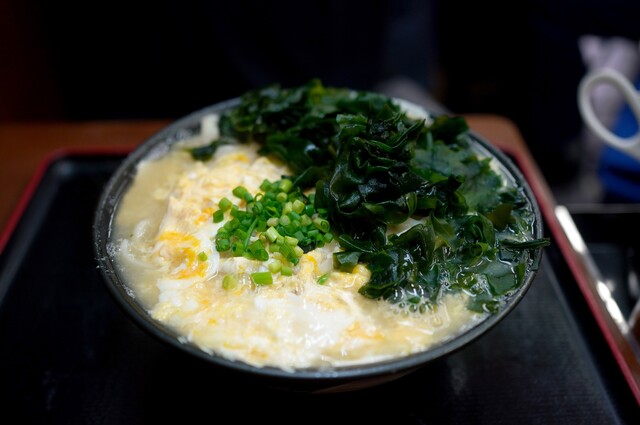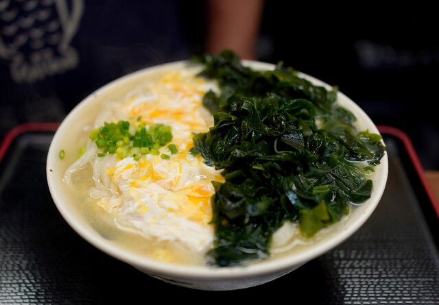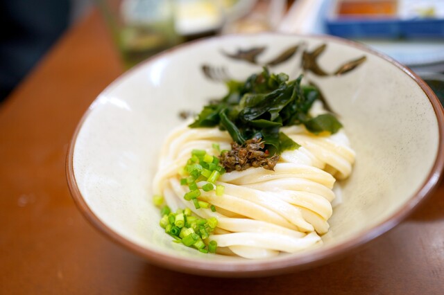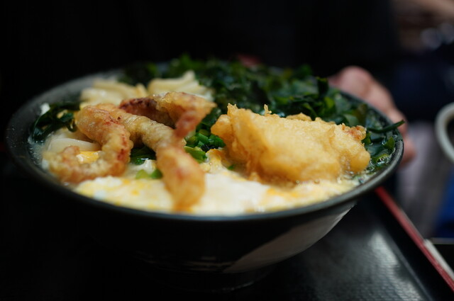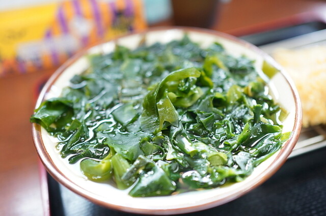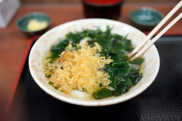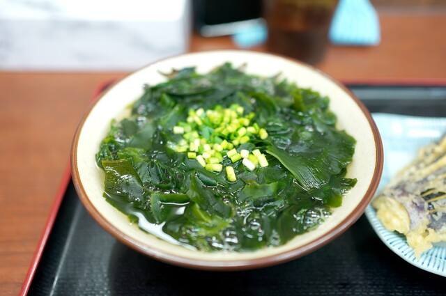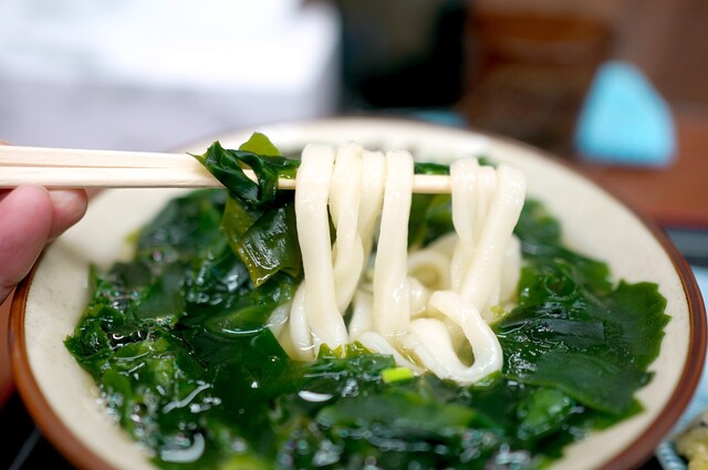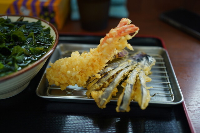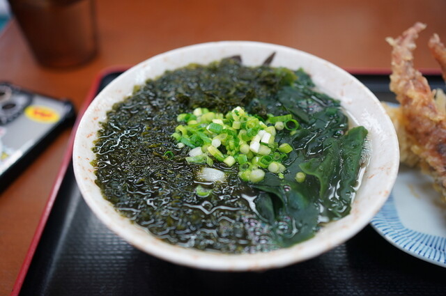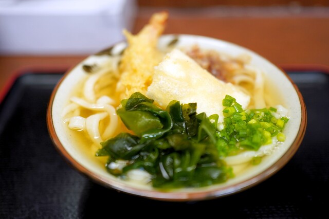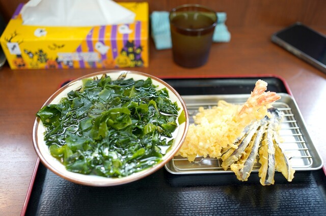 今日はたっぷりわかめうどんとチャーシューうどんに海老天。