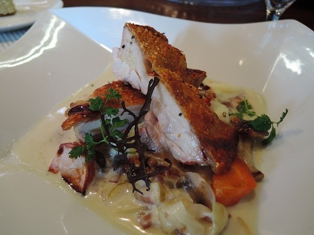 2014冬 メイン 三河地鶏のパリパリ焼き キノコとベーコンのフリカッセソース