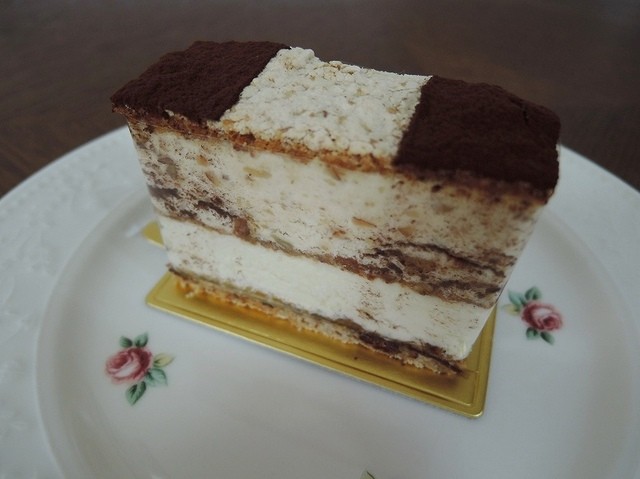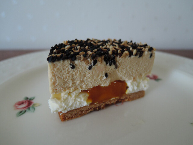 土台のクッキーが香ばしい。胡麻たっぷりのムースとふんわりチーズクリーム、アクセントにマンゴー。全体的に胡麻油の味わいが口の中に拡がりオリエンタルなケーク。初めて味わう未知の味。