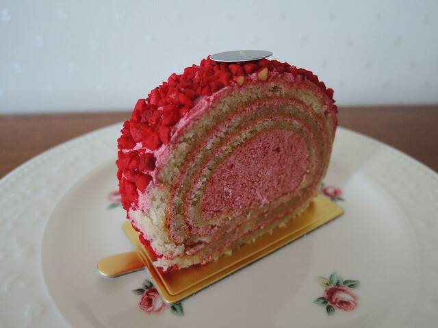 周りに散りばめられたフランボワーズ風味アーモンドダイスの食感が楽しく、フランボワーズバタークリームの酸味と甘さのバランス、しっとりシロップが染み込んだ生地との相性も良い。