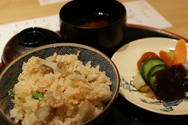 直火炊きで根菜ごはん・・・焼きたらこ&三つ葉も添えて♪