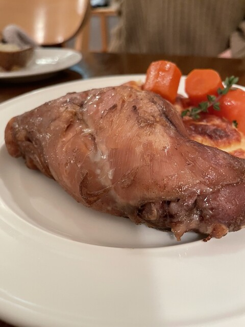 ◆ラパンのコンフィ。フランスの家庭料理でフランスではよく食べられるうさぎのももを骨付きのままコンフィにした豪快な一品