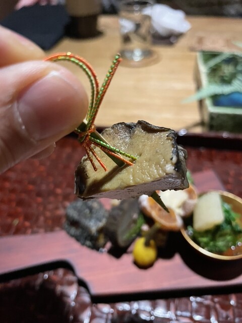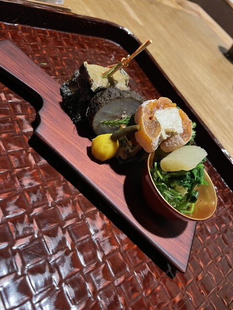◆八寸 蝦夷鮑 粟生 蓮根小豆 牛蒡鴨 玉子帛紗焼き なずなお浸し 数の子 市田柿のフォアグラ 慈姑
