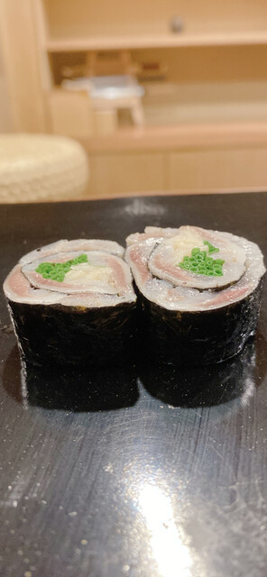 ・〆鯖、大葉、浅葱、ガリの海苔巻き