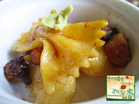 以前から行きたくて気になってたお店なんだけどなんと新見(@_@;)あまりにも遠過ぎて、ずっとお預けになってましたがやっと友達連れてってくれるって云うんで千切れんばかりに尻尾をブンブン振りまくって遠く新見までお邪魔したのは『手打ち蕎麦とフレンチの やな木』暖簾をくぐり、井戸のある、きちんと手入れされたお庭を通って木のぬくもりたっぷりの閑静なたたずまいにしばし足を止めてうっとり♪気になるランチは。。。お魚コース2500円も捨てがたかったんだけどせっかくの新見なんで、千屋肉のコース3000円を予約してました。コース料理は前日までに予約が必要!お茶と揚げ蕎麦のお菓子が運ばれてきてポリポリ食べてると、ステキなアミューズ盛り合わせが運ばれてきましたよぉ ☆水茄子とキュウリのスティック アボカドのディップとともに☆鰻のまぶし風ショートパスタ☆ズッキーニとモッツァレラチーズのミルフィーユバジルソース添え、☆鯵のパセリ焼きヨーグルトソースピンクグレープフルーツにヨーグルトからめてました。☆前菜は海老と野菜のテリーヌ チコリ添え フルーツソース食べるのがもったいないくらい見た目がとても綺麗☆いんげん、ヤングコーン、海老、人参、じゃが芋を夏らしくゼリーでまとめてましたが3種のフルーツソースがホントに美味しくてお皿をペロペロ舐めちゃいたいくらいでした(笑)☆スープは焼茄子のスープと赤ワインのパン☆千屋牛のリソレ 2種類のソース添え(雲丹のシャンパンソース、シークワ—サーソース)どちらのソースも美味しかったけど雲丹のシャンパンソースが絶妙でしたね盛りそばか、茗荷おろしそばか(季節蕎麦)、かけそばをせんたくできるようになっていて田舎蕎麦…黒い外皮ごと挽き込んだ粉で打ったそばなみ蕎麦…丸抜きの粉で打ったそば更科蕎麦…そばの実の中心部だけの粉で打ったそばこちらのお蕎麦は、外2蕎麦って云って蕎麦粉10に対し、つなぎ2の割合で粉を混ぜ合わせ打たれているそうですお酒で云うと大吟醸の更科蕎麦って奥さまに云われ、田舎蕎麦と更科蕎麦をシェアしていただきました。コトコト煮たものは底に、香ばしく揚げたものは浮き実に〜蕎麦湯も凄く美味しかったです。デザートはマンゴーゼリーとココナッツゼリー、フルーツ添えと紅茶アイス♪どれもこれも1品1品丁寧に作られてるのがひと目でわかる見た目でもシッカリ楽しめる蕎麦とフレンチは特にフルーツソースが絶品でした。新見はかなり遠いけどまた別の季節に再訪出来ると嬉しいなぁ(*^_^*)