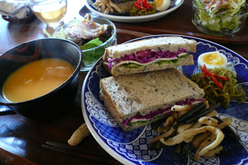 見た目も綺麗なサンドウィッチセット(@1300)は、スープ、サラダ、お惣菜2種、穀物コーヒー、デザート付き。