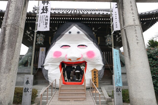 毎年2月の節分厄除大祭の時期、門に設置される巨大な『おたふく面』を観に行きました。